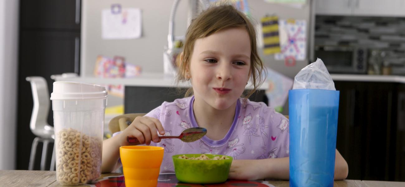 Sandrine is ready to have breakfast but she needs several items on her table. A placemat, a bowl, a glass, a spoon, cereal and many other things like milk and a banana. She now knows how to prepare, eat her breakfast and even clean up when she is done. And you? Are you ready ?