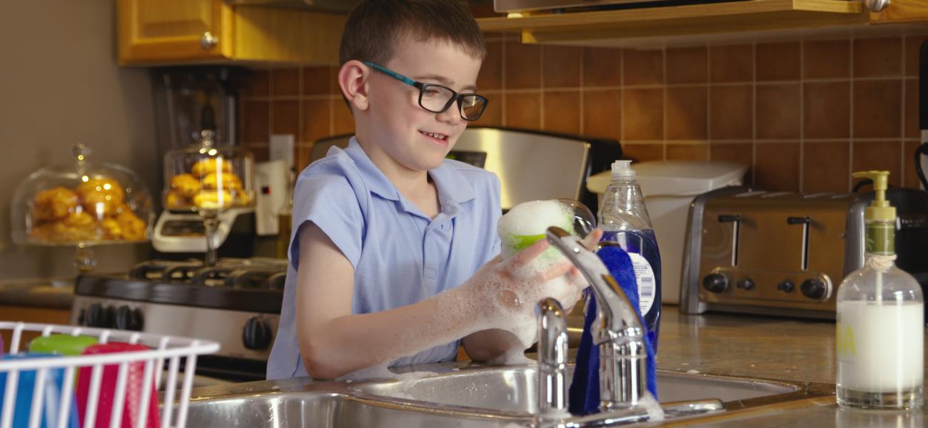 Zakary has just finished his dinner and is ready to wash his dishes. He is careful not to waste too much. He doesn't use too much water and soap. He pours a little bit of warm water and with the help of a sponge, he rubs his bowl, his glass and his utensils. He takes so much pleasure in washing the dishes but he also makes sure to dry them well and put them back in their place. And you? Are you ready?