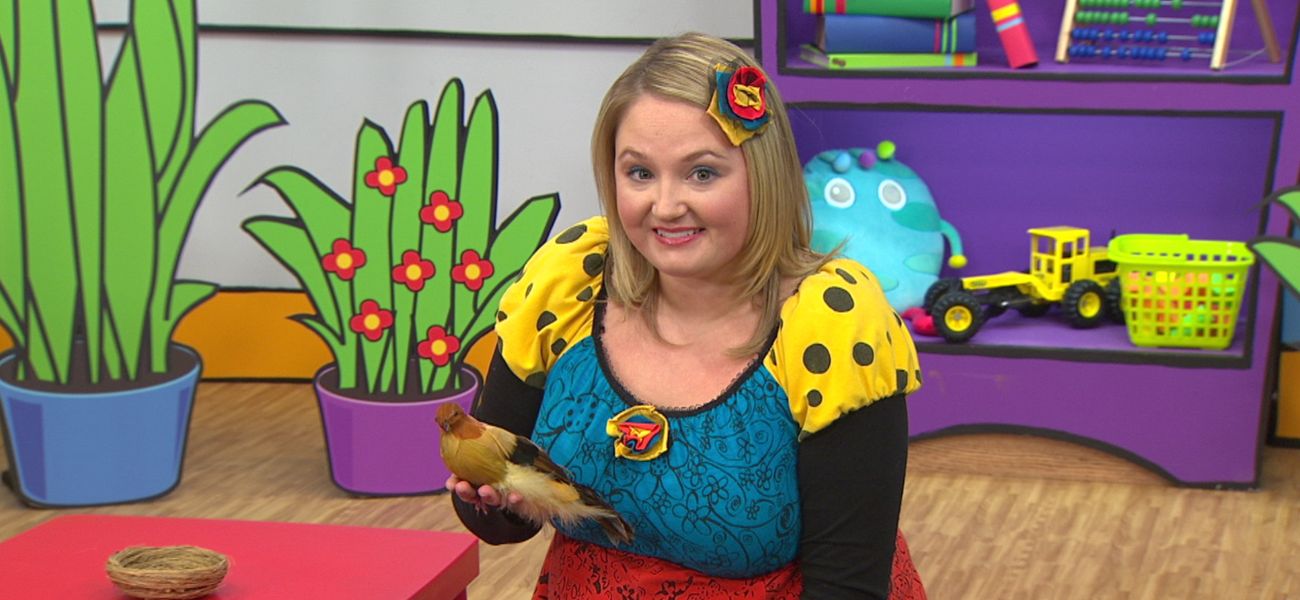 Josée trouve un loup en peluche sous la tente et récite la comptine « Alouette » en invitant les enfants à chanter avec elle.
