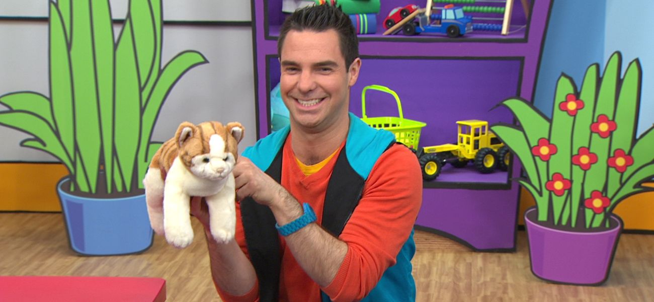 Louis trouve un chat en peluche sous la tente et récite la comptine « La mère Michèle » en invitant les enfants à chanter et à bouger avec lui.